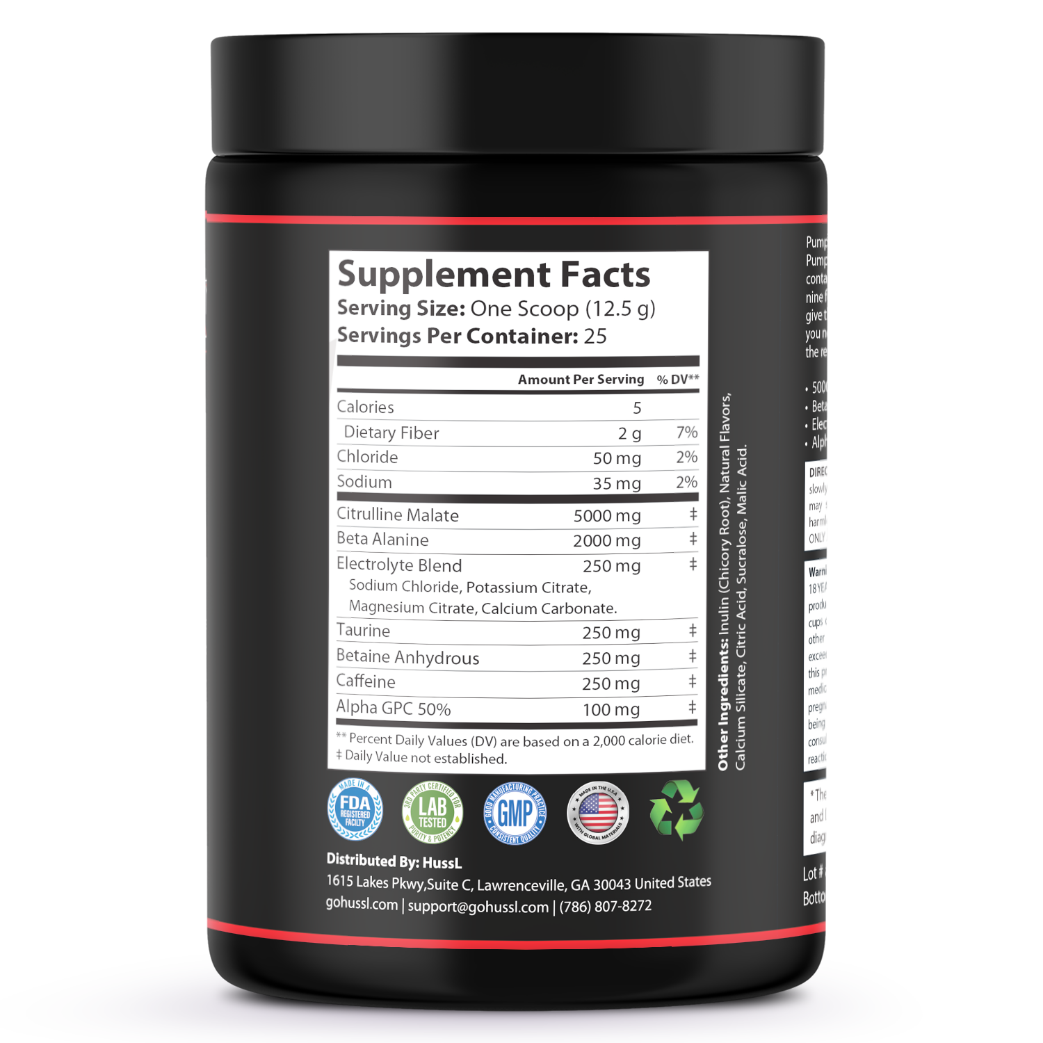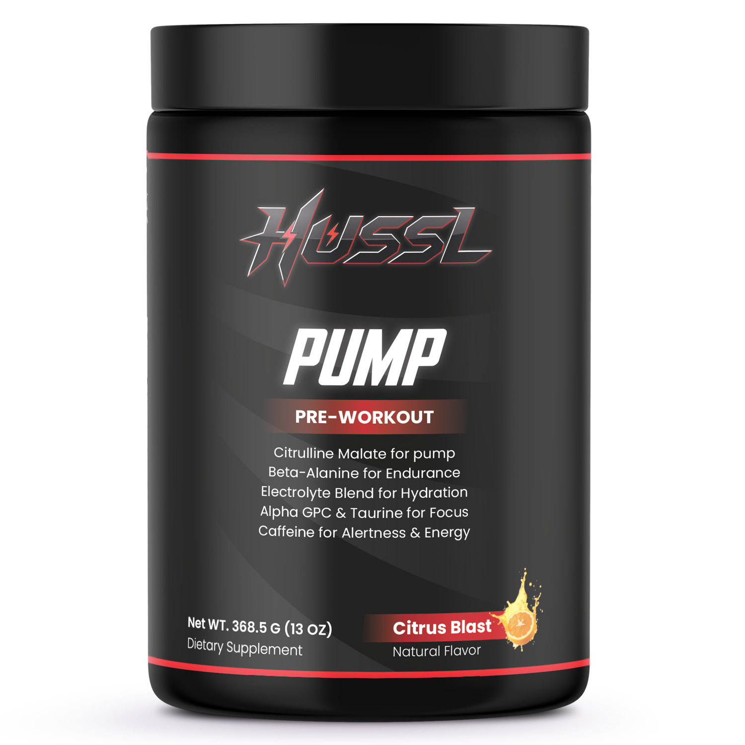 HussL Pump Pre-Workout Citrus Blast 312g w/ Natural Flavor is ideal for those who require more Pump, Focus and Energy for their training. HussL Pump contains an electrolyte blend for Hydration, Beta-Alanine for Endurance, and 5000mg of Citrulline Malate to give that muscular "Pump". This formula has everything you need for more intense workouts that will get you the results you want.